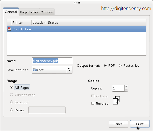 Step 3:Click on Print to File option. When you click on Print to File option, then you see many options appear on your screen like as Name,Save Location,PDF or Postscript,Range copies etc. image look like this: