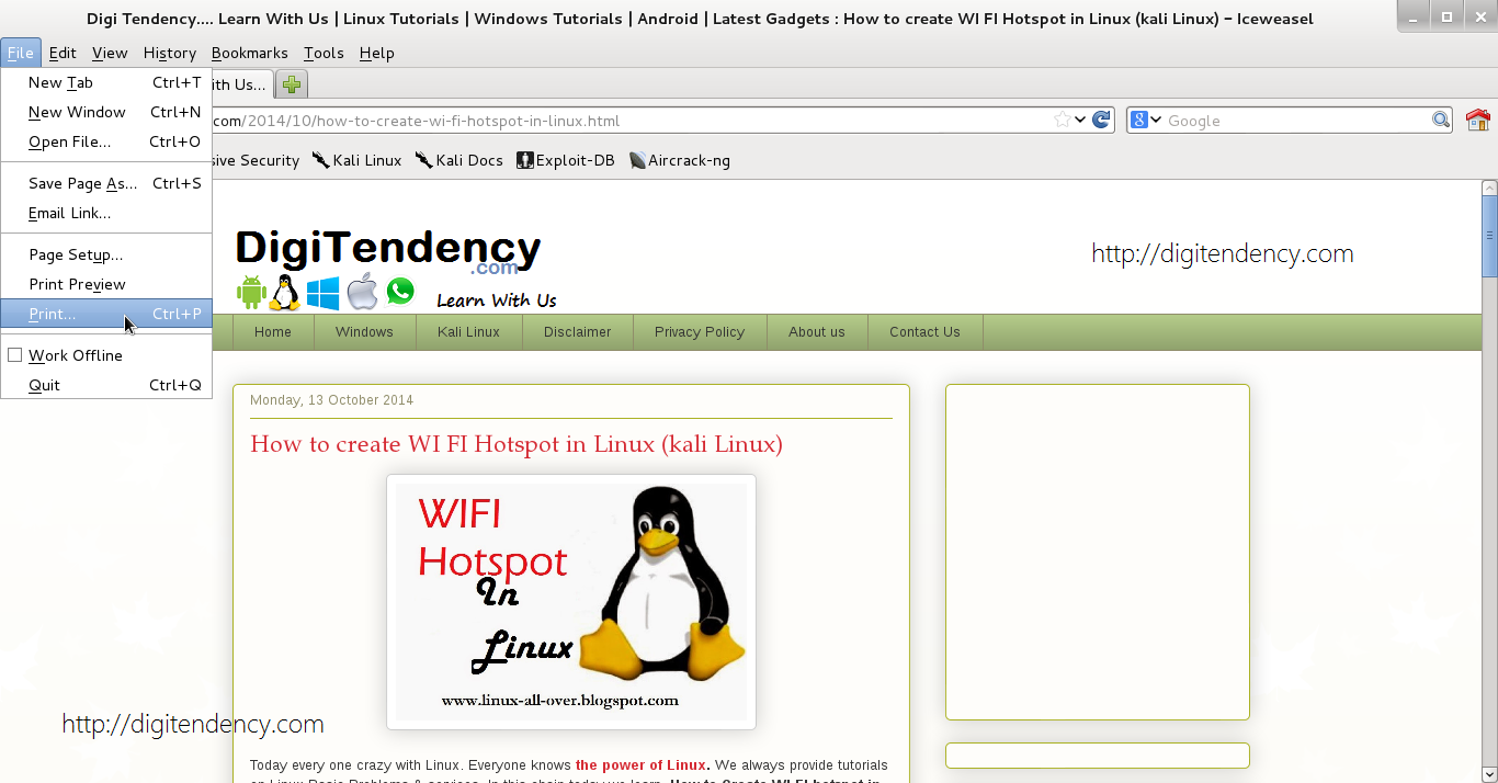 Step 1: If you using Firefox or Iceweasel Browser then first open your webpage which you want to save in PDF Format. After opening the web page Click on File Menu and select Print option.